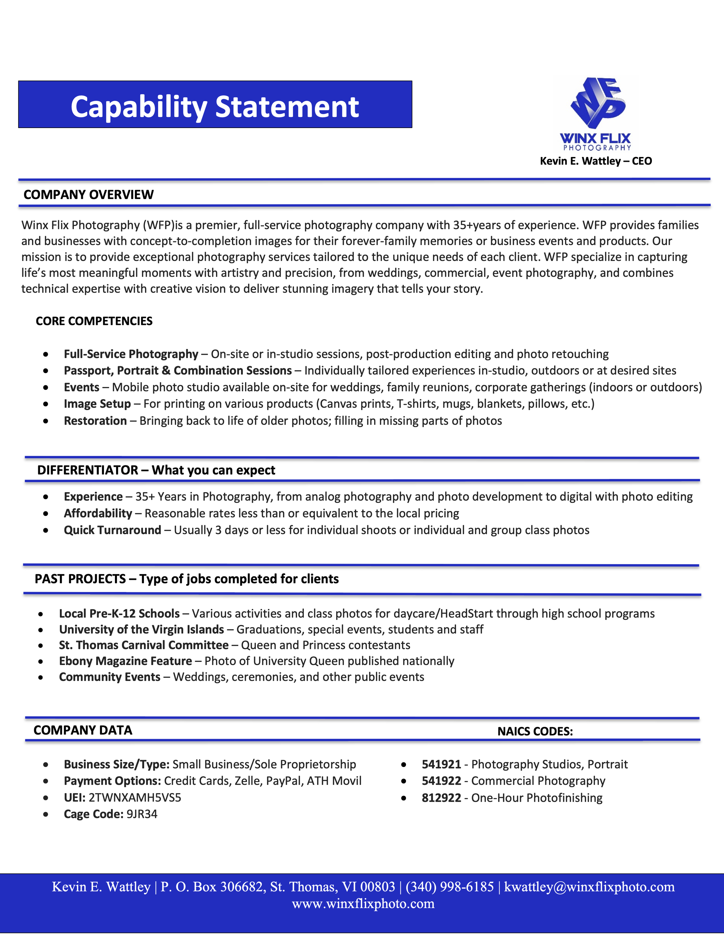 Winx Flix Photography (WFP) offers a variety of photography services to include engagements, weddings, graduations, family portraits, school/class photos, still life/scenic photography, action/event photography, and private sessions such as pregnancy and newborn photos. Passport photos and image restoration services are also available.
